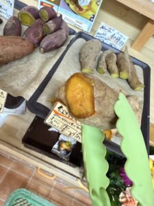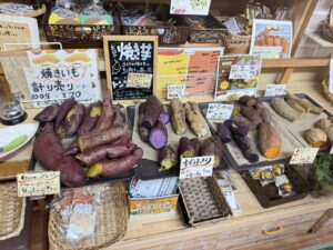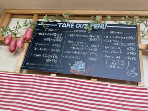店内に入ると、色々な種類の焼き芋や焼き菓子などがあり、テイクアウトメニューもたくさんありました。