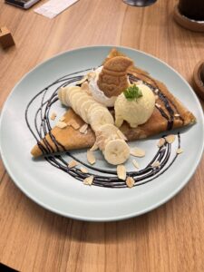 クレープの種類が多すぎて、モンブランも食べたいし、あんバターやバターシュガー等々、私の好きな物がたくさんありすぎて、悩みに悩み今回はモンブランを注文し、友人はお皿のクレープのチョコバナナを注文。